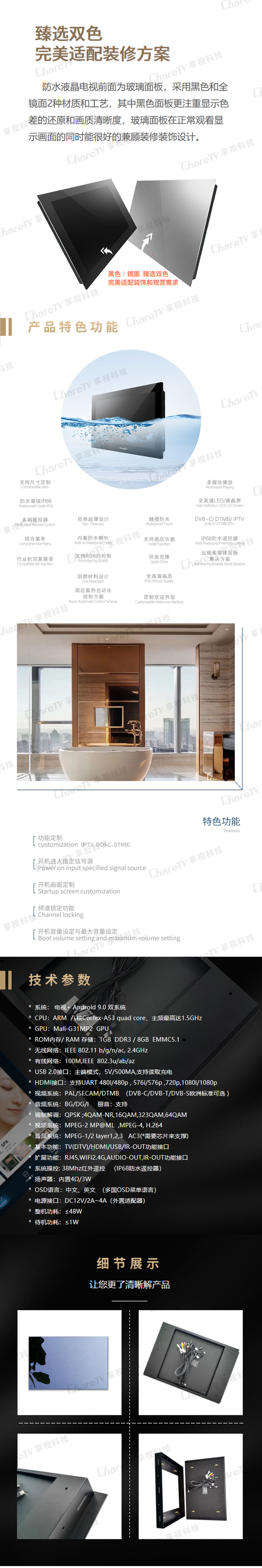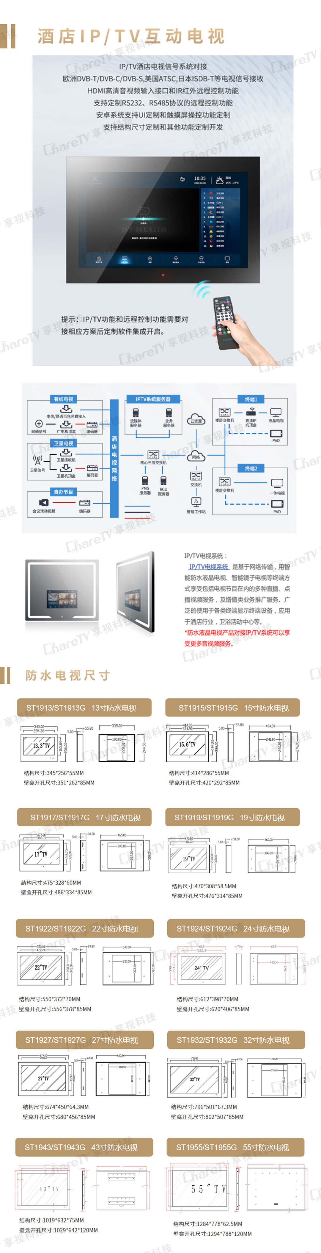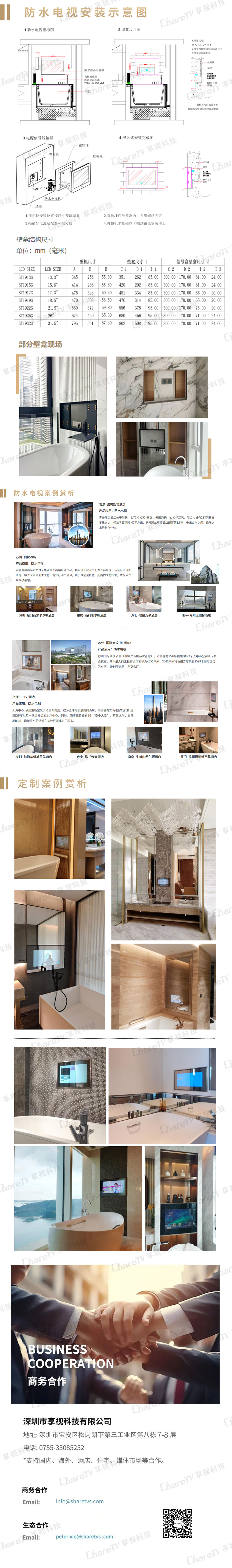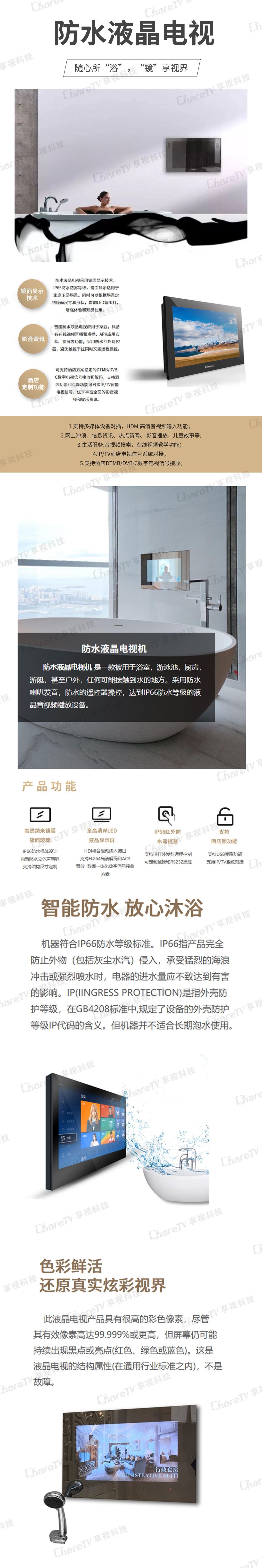 ShareTV防水電視,擁有防水IP66的等級認證,配置全高清LED/液晶屏、防水喇叭、IP68防水等級的防水遙控器,保證全方位的防水之余,同時實現超薄機身設計,支持DVB-C/ DTMB/ IPTV及相關酒店功能,支持尺寸、顏色、功能定制,搭載智能應用,深度切合客戶要求的定制化體驗,讓每一個使用者無時無刻,任何地點都能領略到電視的精彩。