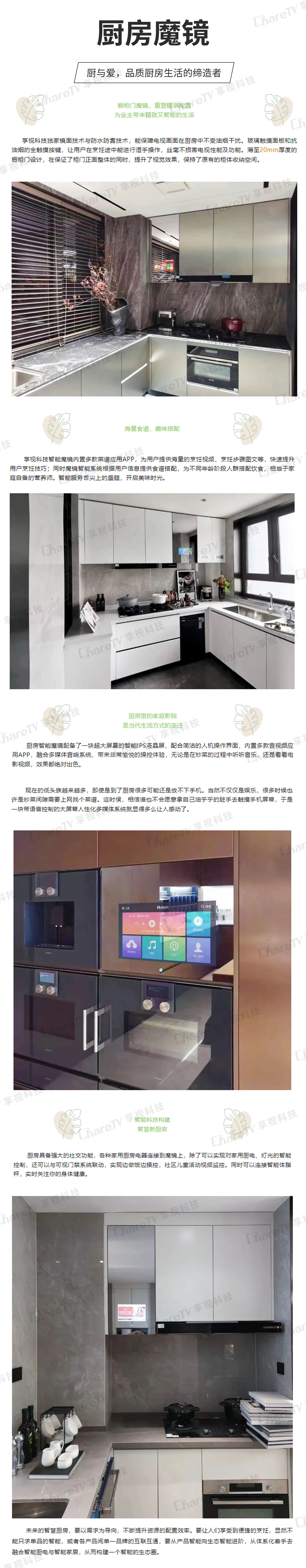 廚房智能魔鏡基于智能魔鏡平臺上,可以通過語音識別等技術,協助人們進行食材的管理,還將能與外接設備連接,結合你的身體情況、飲食數據來提供營養健康方案。可以徹底解放雙手,通過廚房魔鏡,讓廚房家電之間智能互動起來。廚房智能魔鏡可以很輕松地安裝在櫥柜上,廚房電視機的機身尺寸很薄、質量輕盈,幫你節省廚房空間。