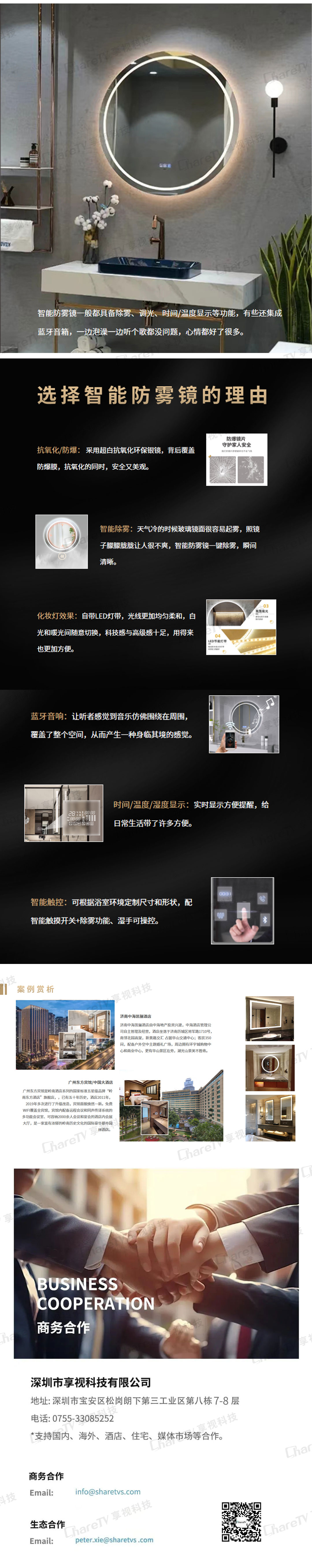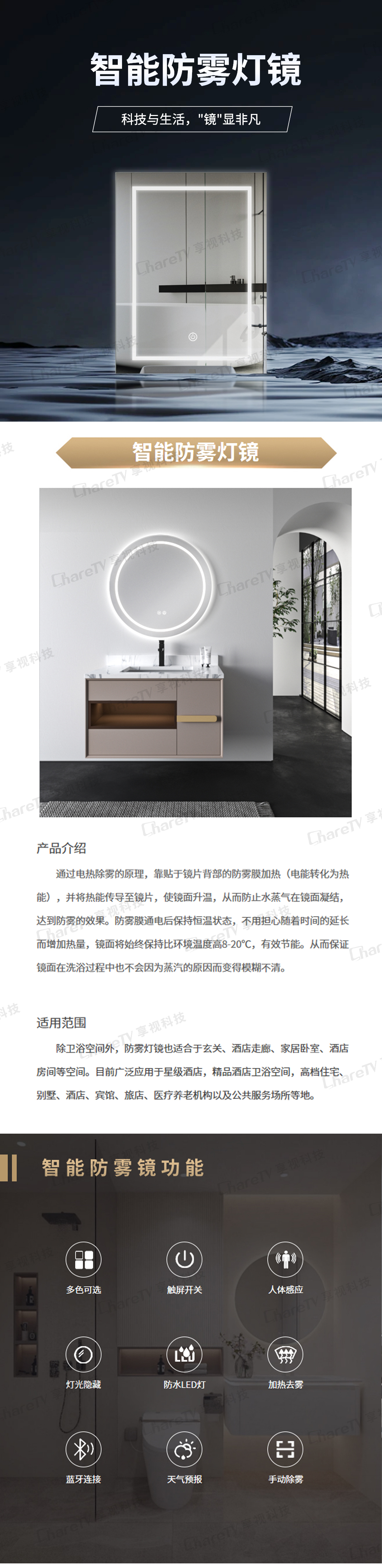智能防霧燈鏡是一種應(yīng)用了先進(jìn)技術(shù)的浴室鏡,具有防霧功能,可以在洗澡時防止鏡子起霧,確保清晰的反射和視覺體驗(yàn)。這種鏡子通常采用加熱或超聲波技術(shù),能夠有效防止鏡面上的水汽凝結(jié),保持鏡面清晰。智能防霧燈鏡還可能具有照明功能,為使用者提供更好的觀察和化妝環(huán)境。