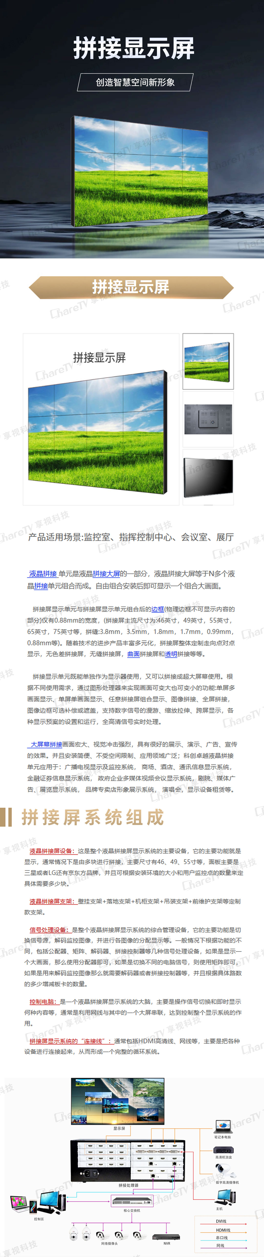 液晶拼接單元是液晶拼接大屏的一部分,液晶拼接大屏等于N多個液晶拼接單元組合而成。拼接顯示單元既能單獨作為顯示器使用,又可以拼接成超大屏幕使用,自由組合安裝后即可顯示一個組合大的拼接顯示屏畫面。
