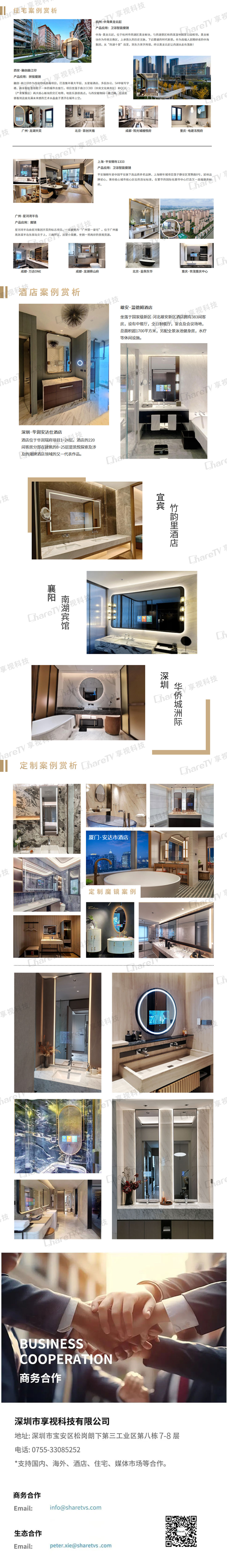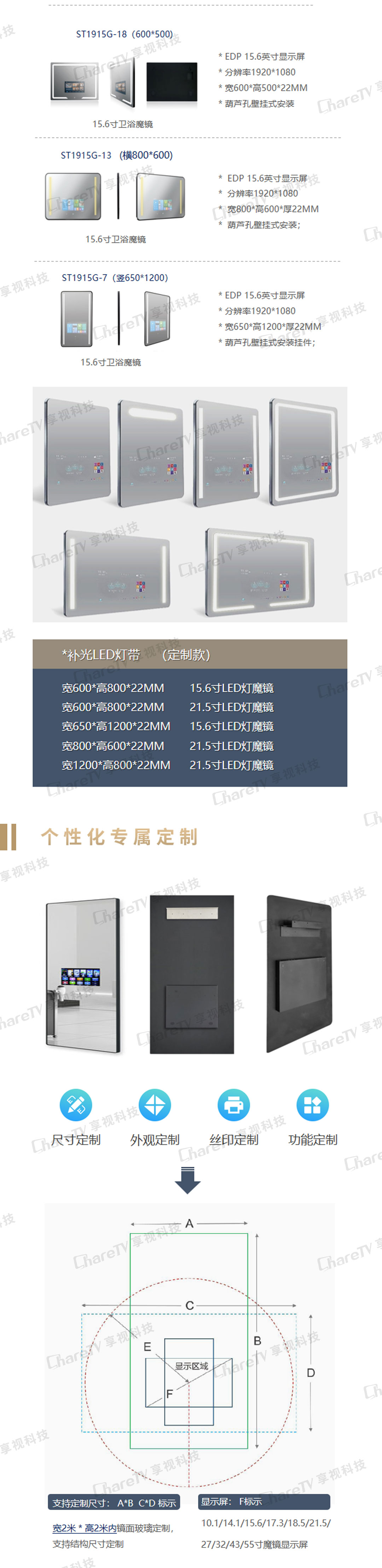 隨著時代的發展,科技的進步,5G技術的推廣,越來越多的智能化功能會逐漸實現,ShareTV的智能魔鏡便是其發展智能化的一個載體。智能魔鏡既是在浴室洗手臺上一個可觸式防水屏幕,也是儲物柜的鏡面柜門中的一個智能化產品。承載Android系統,可配置以藍牙相接的體重秤與皮膚水分檢測儀,實現身體健康的實時管理;而配合各種各樣的安卓app,使產品變得更自定義化。