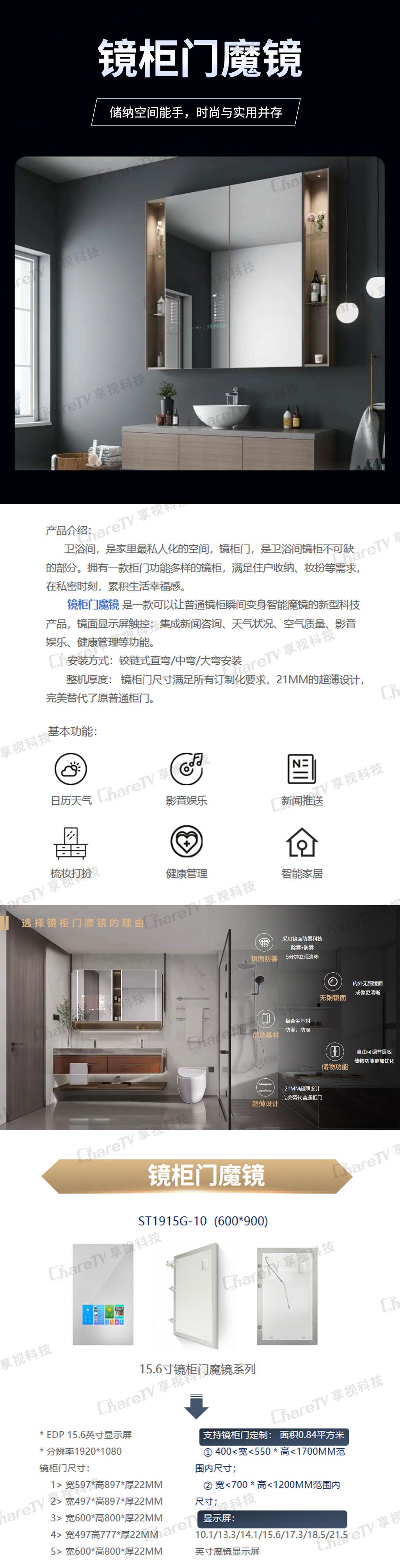 智能櫥柜門魔鏡可以實現儲物功能,標準尺寸為900*600mm,滿足櫥柜門基本尺寸需求,同時支持產品定制,適應多尺寸安裝,滿足各種安裝需求,一柜多用、共享智慧空間、