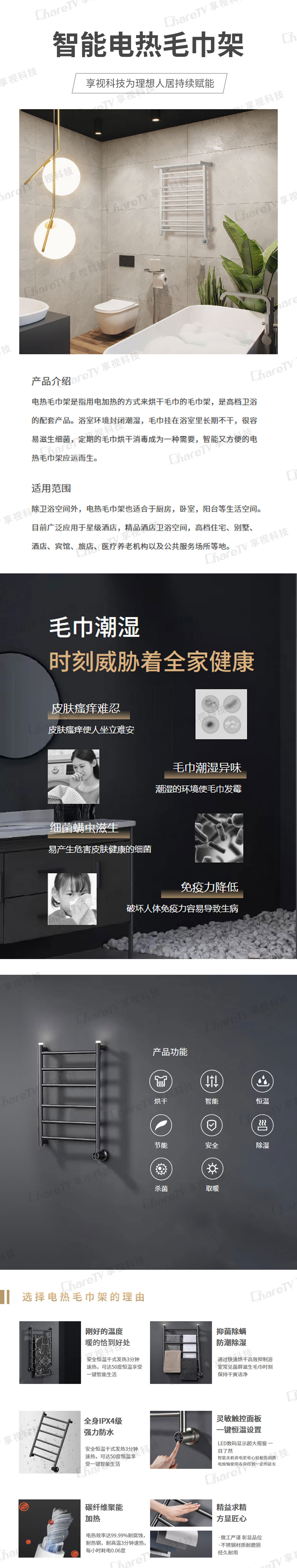 智能電熱毛巾架在普通電熱毛巾架的功能結構基礎上實現了智能化的技術革新,深度傳承了智能化、舒適性、人性化的用戶體驗。利用綜合網絡通信技術、安全防范技術、自動控制技術等,構建成高效智慧的毛巾架使用和管理系統,提升衛浴家居的安全性、舒適性、便利性和藝術性,并為用戶打造節能環保的衛浴空間。