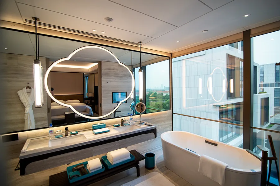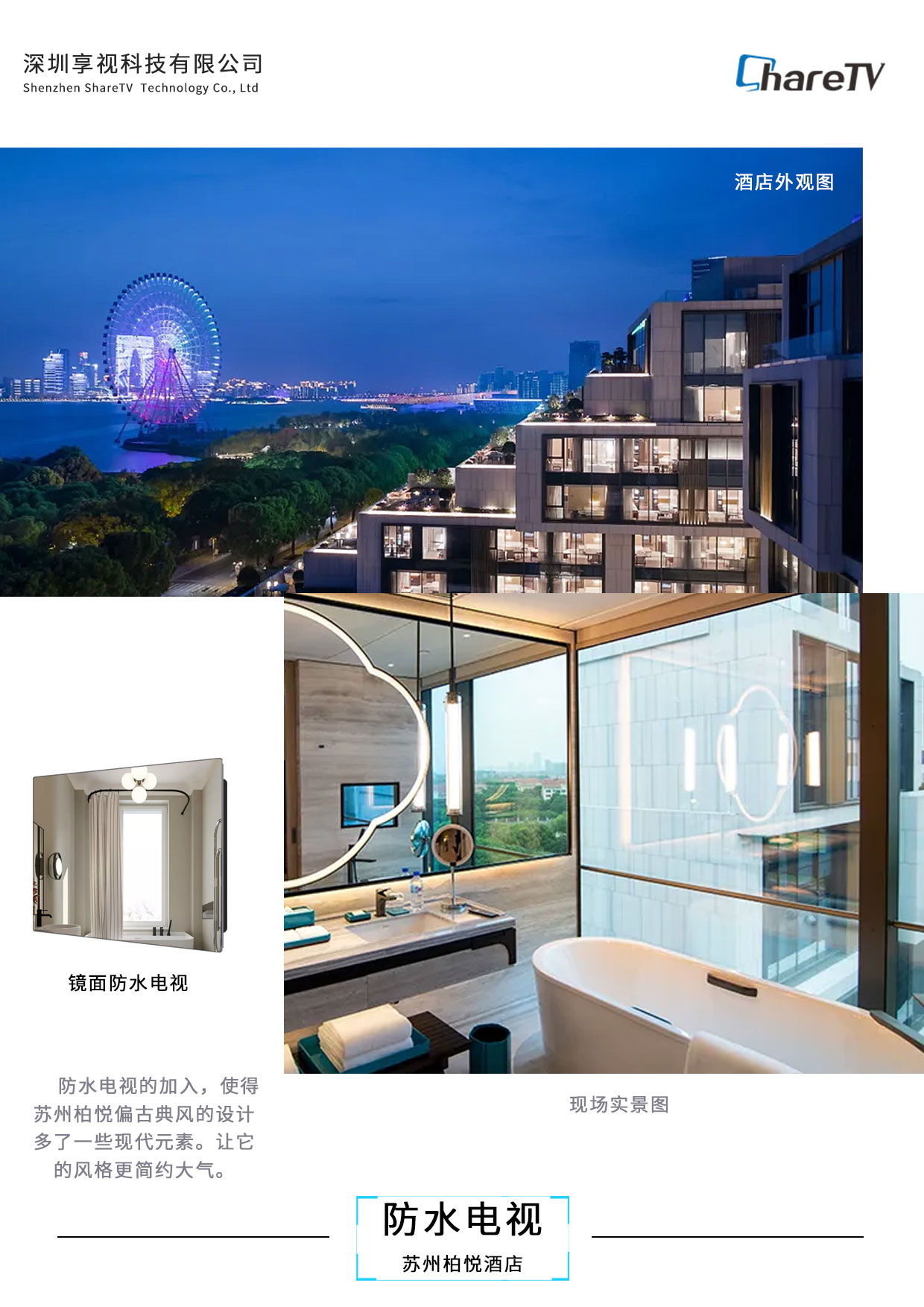 蘇州柏悅酒店這次的室內家電選用了我司的智能防水電視,科技智能的運用與酒店的傳統宅院式設計相融合,為酒店的整體風格增添了一抹藝術的神秘氣息。